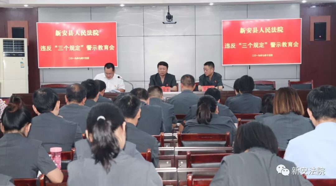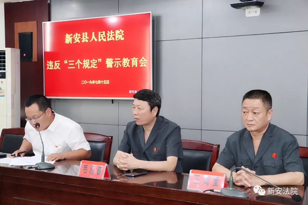 ▲7月15日上午,新安县人民法院召开违反“三个规定”警示教育会。参加会议的有县法院党组书记、院长毛迎春、副院长王周奎、县纪委派驻新安法院纪检监察组组长郭小锋和全体班子成员、部门负责人以及全体员额法官。