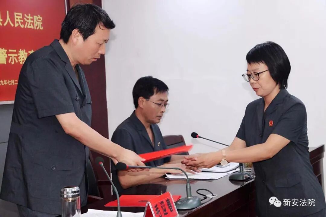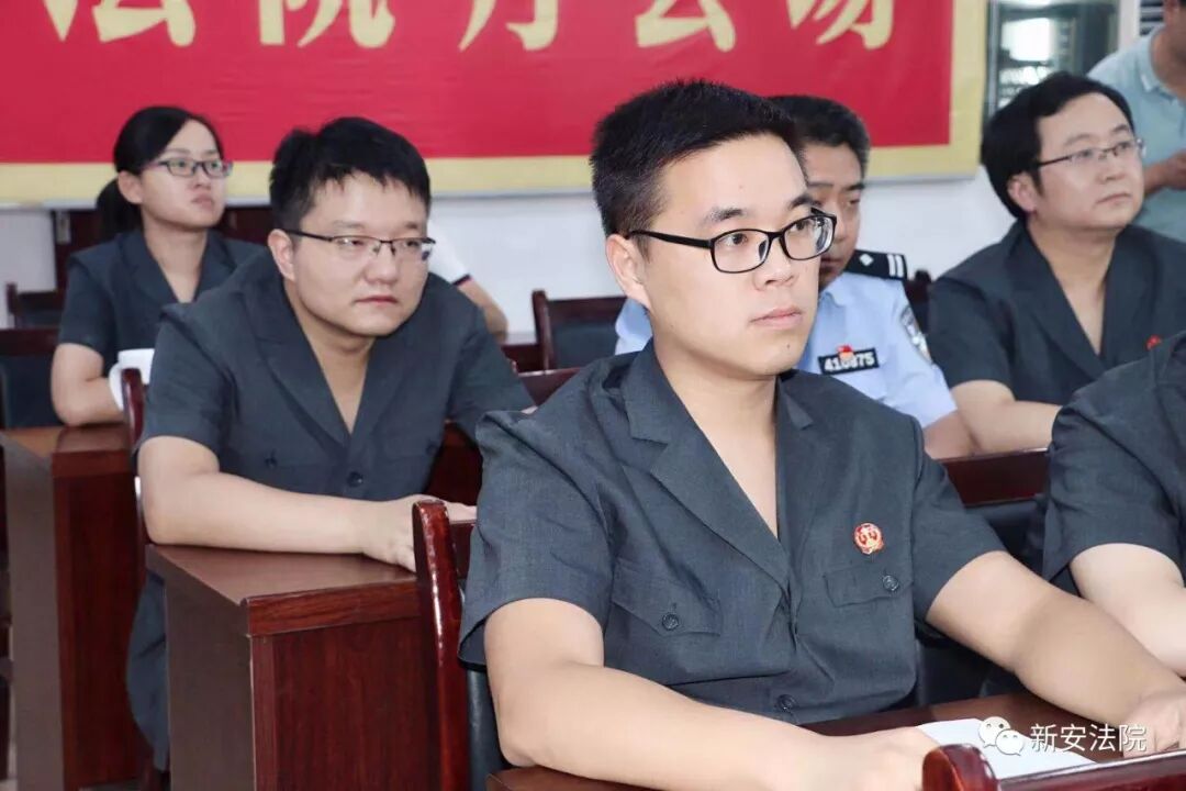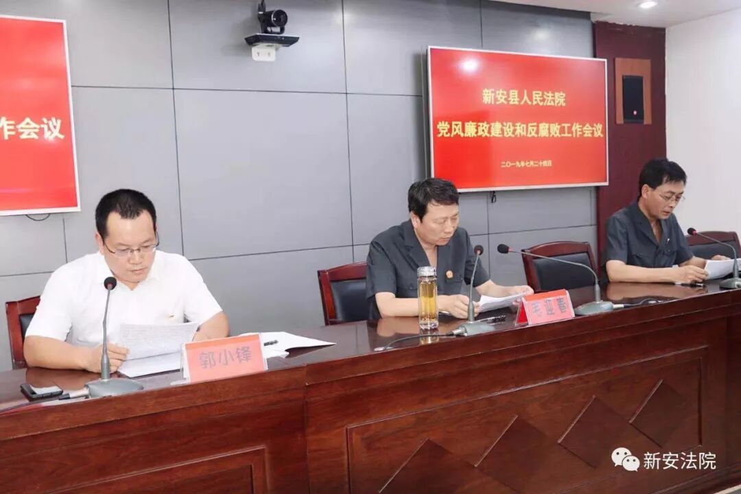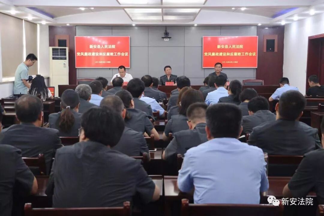 ▲党组书记、院长毛迎春、党组副书记、副院长李世憬、县纪委派驻新安法院纪检监察组组长郭小锋等全体班子成员、干警参加了会议。会议旨在激励大家坚持正确政治方向,自觉履行全面从严治党主体责任,严格落实中央八项规定精神,并分析法院当前发展存在的短板和问题,研究部署2019年下半年工作。