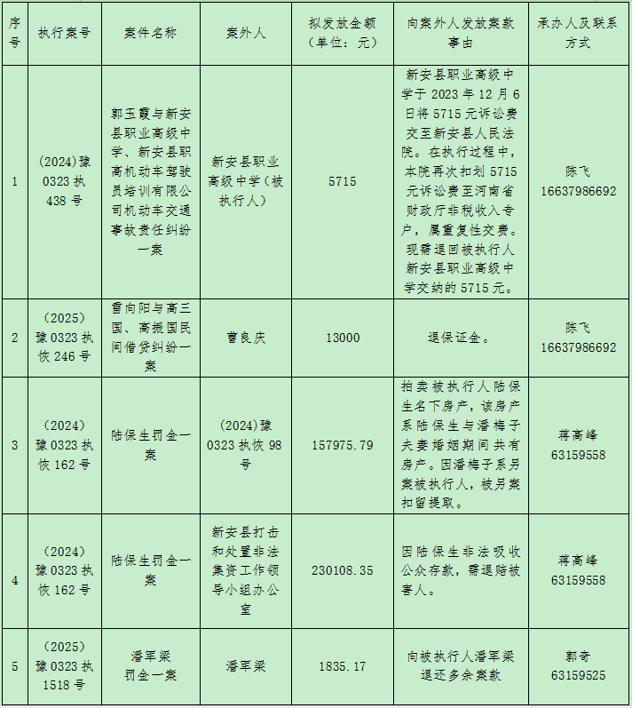为进一步规范执行案款收发、管理,完善执行案款管理工作,维护当事人合法权益,防患廉政风险,现将新安县人民法院拟向案外人发放的金额公示如下:
