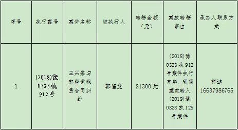 为进一步规范执行案款收发、管理,完善执行案款管理工作,维护当事人合法权益,防患廉政风险,现将新安县人民法院拟向(2019)豫0323执129号案件案款转移的公示如下: