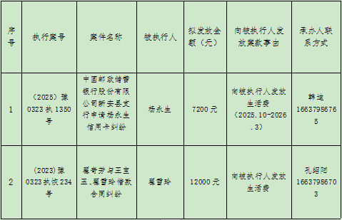 新安县人民法院关于向被执行人发放生活费案件的公示